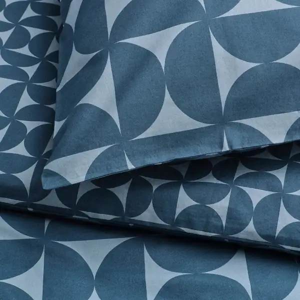 Duvet cover set with graphic pattern in easy-to-coordinate dark and light blue tones. The dense percale quality and fine cotton/viscose yarn make the fabric cool, crisp and soft.