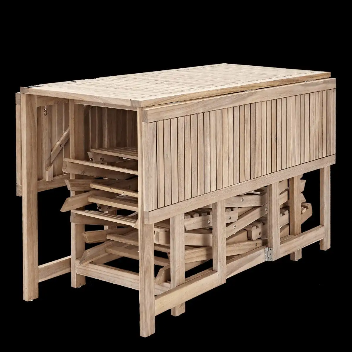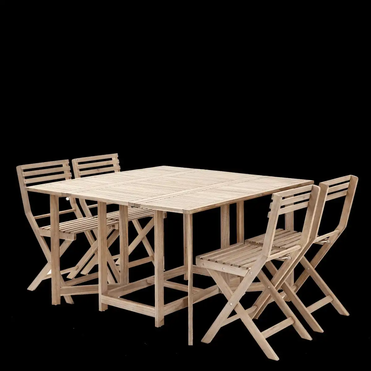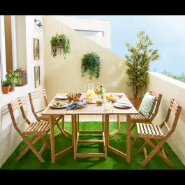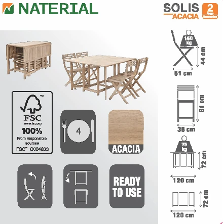 NATERIAL Solis table and chairs set in brown acacia 4-seaterFor 4 people, it is suitable for balconies, verandas and patios, convenient even for occasional useRibals that can be closed and storage space for folding chairs inside the table, to ensure maximum space savingsFinishing oil leaves the wood with its natural blond appearance. The FSC label allows you to make a conscious choice for products that are obtained from ecologically appropriate forest managementmultiposition to fit your needs.