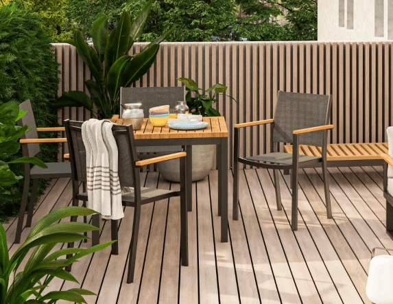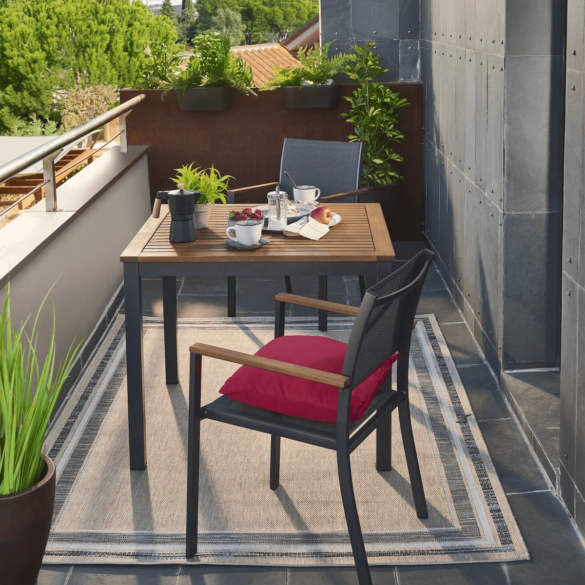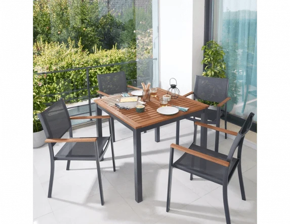 NATERIAL square garden table with eucalyptus topW 89 x D 89 cmFor 4 people, suitable for gardens or medium-sized rooms such as verandas and terraces and large balconiesAluminum frame makes it lightweight and weatherproofThe FSC label allows you to make a conscious choice for products that are obtained from ecologically appropriate forest managementScrews and instructions included, for easy assembly.