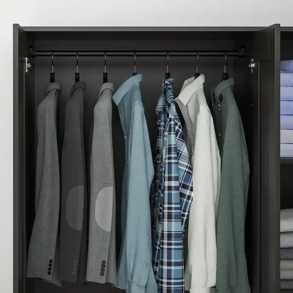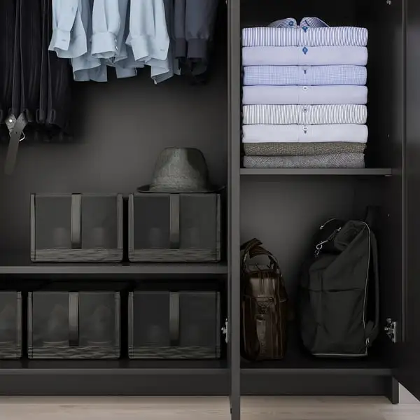 Small spaces need smart storage. This wardrobe has a clothes rail for shirts and dresses, shelves for folded clothes, shoes and bags – and a mirror door too so you avoid needing to mount a separate mirror.