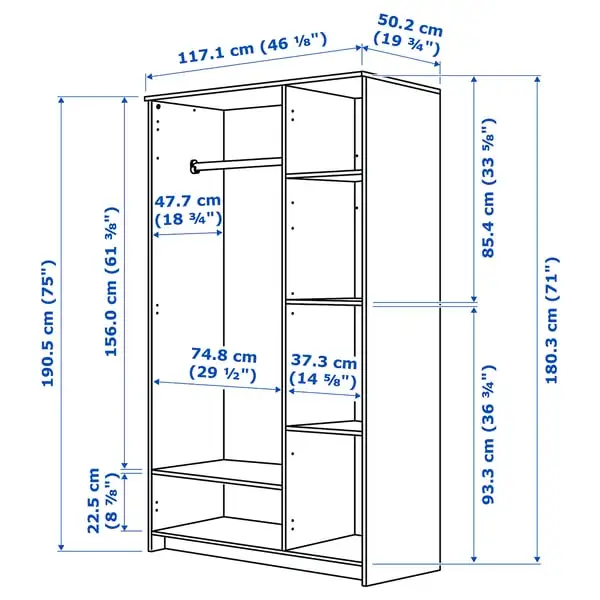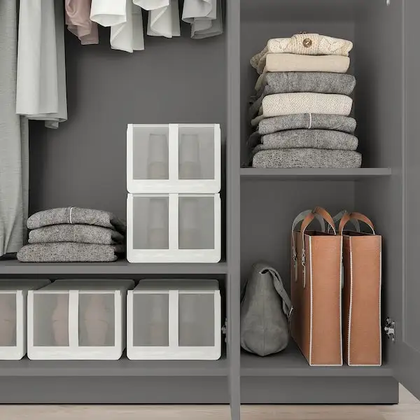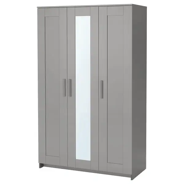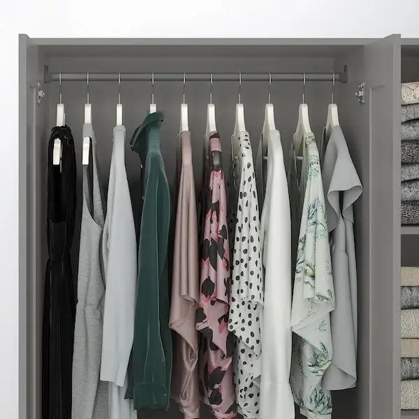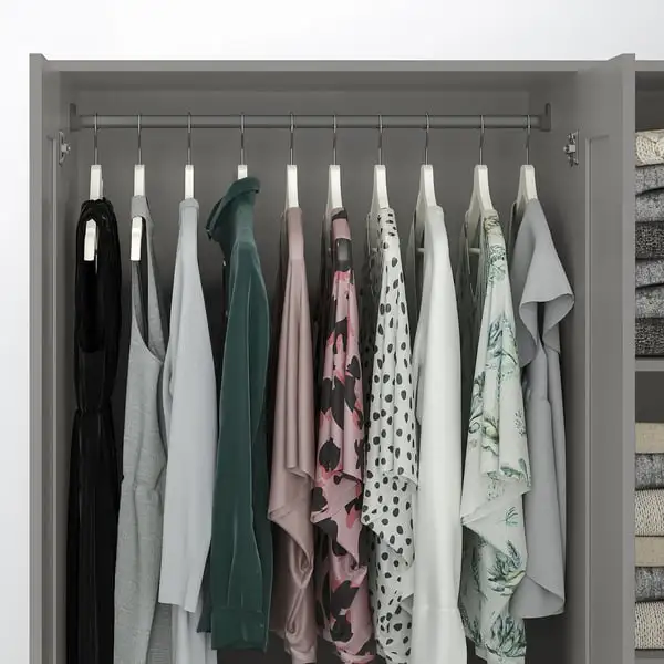 Small spaces need smart storage. This wardrobe has a clothes rail for shirts and dresses, shelves for folded clothes, shoes and bags – and a mirror door too so you avoid needing to mount a separate mirror.