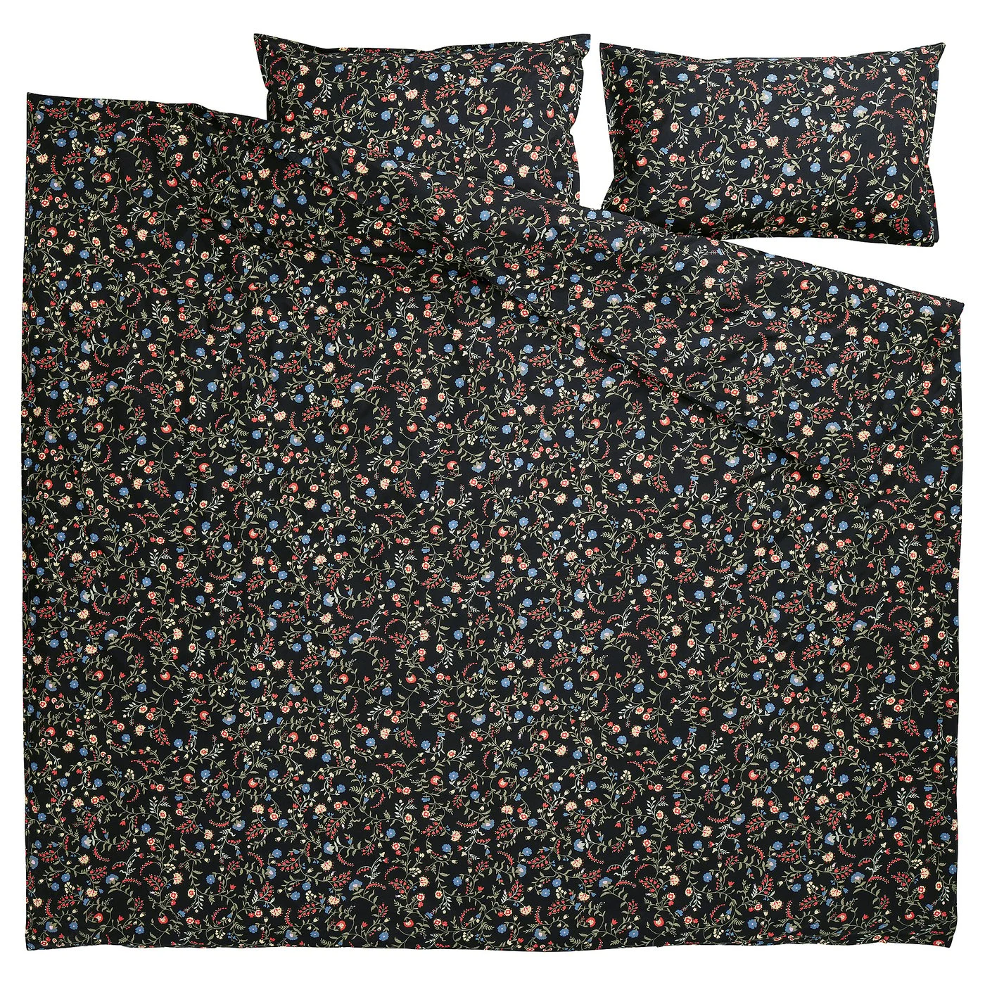 BRUDKRUSBÄR duvet cover set is made of 100% GOTS-certified organic cotton – a natural material that breathes, absorbs moisture and feels comfy against your skin. Swirly wildflower pattern on a black base.