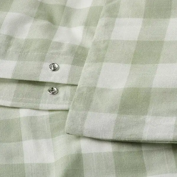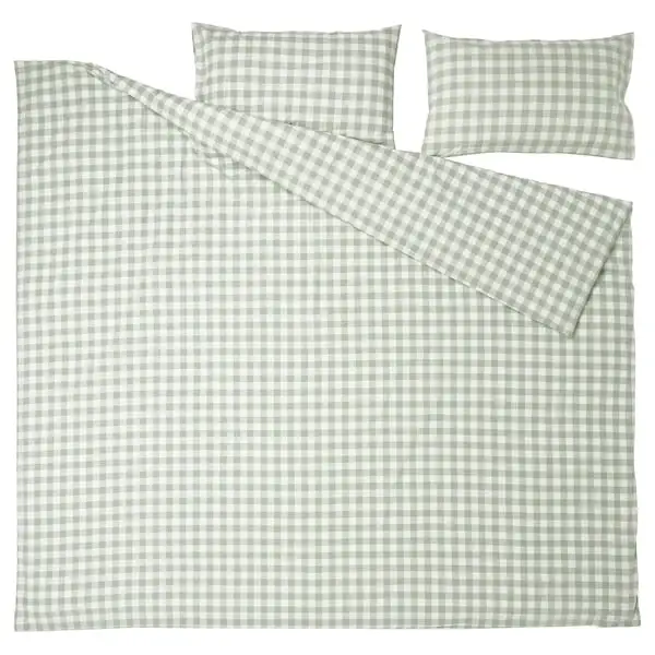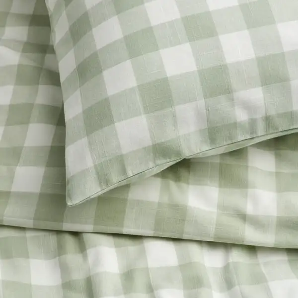 Duvet cover set made of 100% organic cotton certified by GOTS. The natural material breathes, absorbs moisture and feels comfy against your skin. Yarn-dyed gingham check pattern in pale grey-green/white.