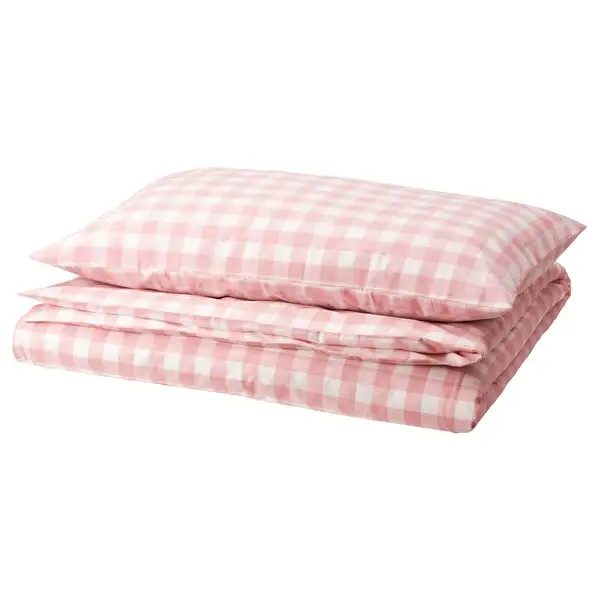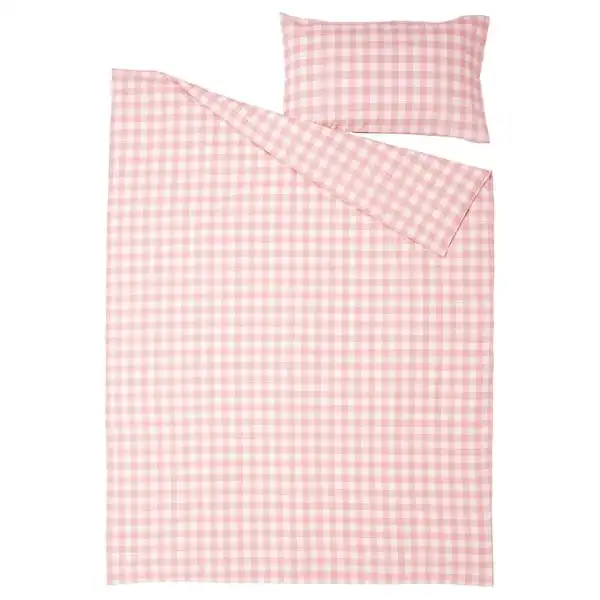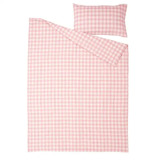 Duvet cover set made of 100% organic cotton certified by GOTS. The natural material breathes, absorbs moisture and feels comfy against your skin. Yarn-dyed gingham check pattern in light pink and white.