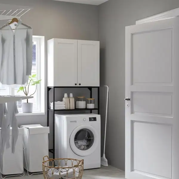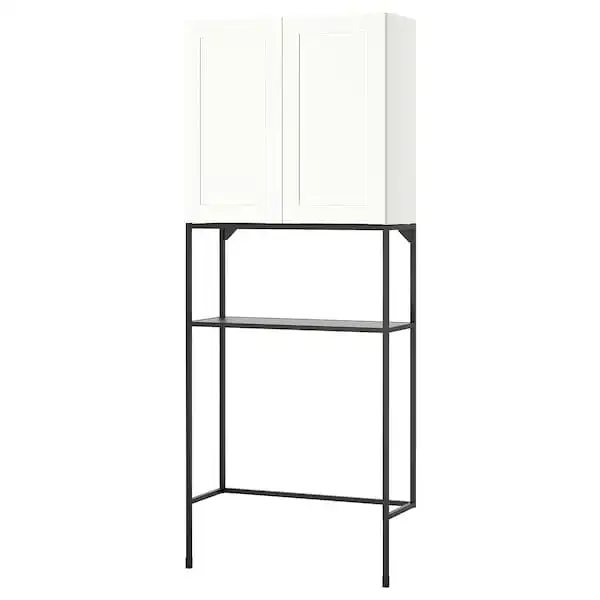 A clever combo that makes good use of the wall space and takes up minimal floor space. Everything is within reach - the messy stuff goes inside the cabinet and everyday essentials are out in the open.