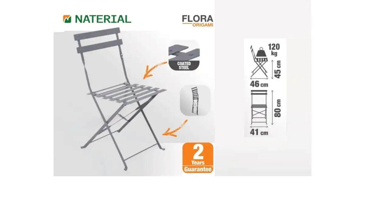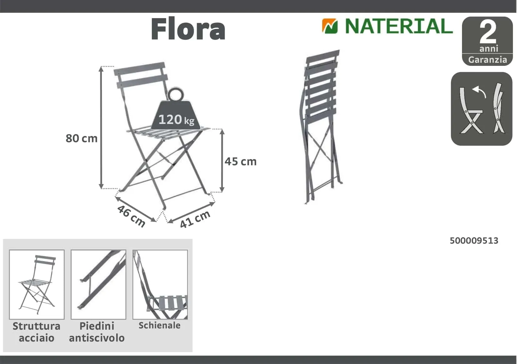 Flora NATERIAL steel folding cushionless garden chair anthracite colorIdeal for small spaces and occasional uses.Foldable for maximum space saving when not in use.Already assembled.Easy to clean.