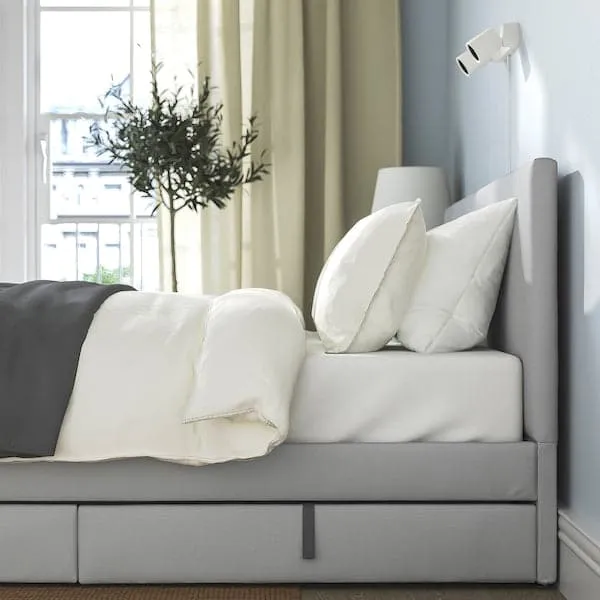 GLADSTAD upholstered bed frame with bed storage boxes has a clean and modern design with a padded headboard and soft cover. The storage boxes are easy to roll in under the bed – for practical storage.