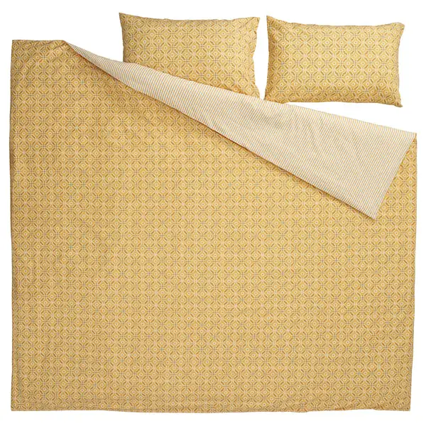 HAMNSENAP duvet cover set has a nostalgic, geometric pattern on one side and yellow stripes on the other – just flip it for an easy refresh! The soft cotton/viscose blend breathes and has a fine sheen.
