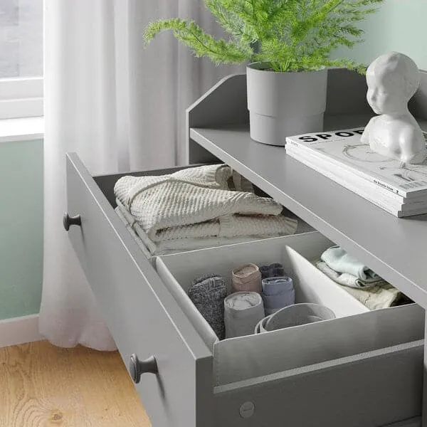 Use in your bedroom or throughout the home, on its own or with other furniture in the HAUGA series. This wide combination has plenty of storage space – and the top is ideal for a lamp or displaying things.