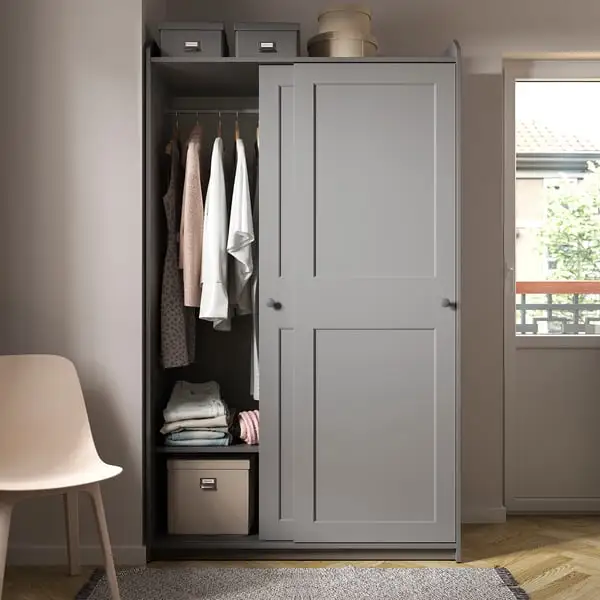 Use throughout the home, on its own or with other furniture in the HAUGA series. Sliding doors give you the space you need. Do you fold or hang? No need to choose, this wardrobe offers both possibilities.