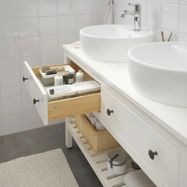 A simple, crafted look with Scandinavian appeal combined with modern function like a smooth-running drawer that closes softly each time and a handy shelf for your lovely plush towels.