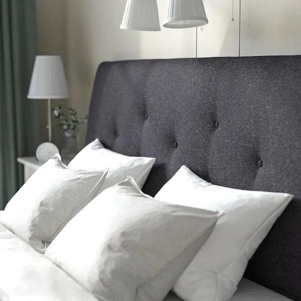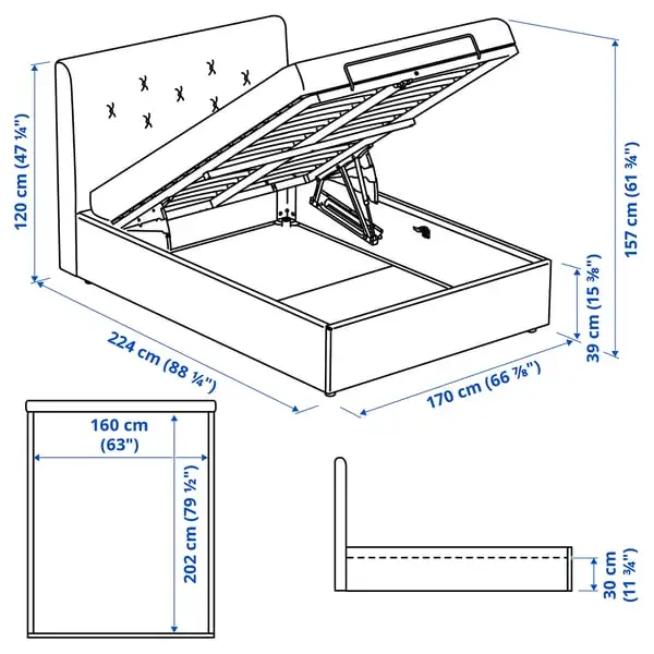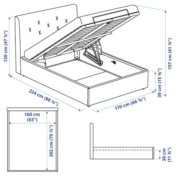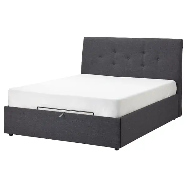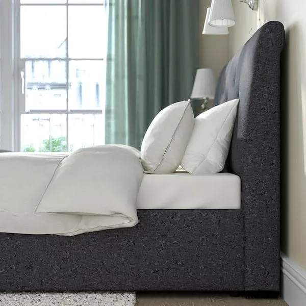 The sloping headboard and soft upholstery make IDANÄS ottoman bed extra comfortable. Classic button detailing is timeless, while the space under the bed adds generous everyday storage.
