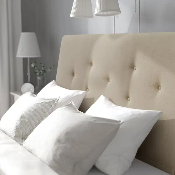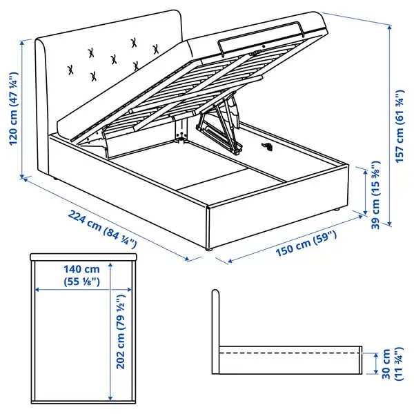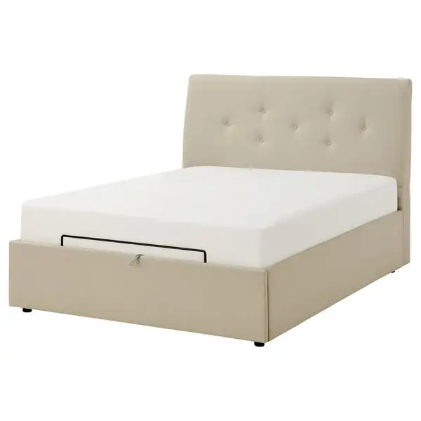 The sloping headboard and soft upholstery make IDANÄS ottoman bed extra comfortable. Classic button detailing is timeless, while the space under the bed adds generous everyday storage.