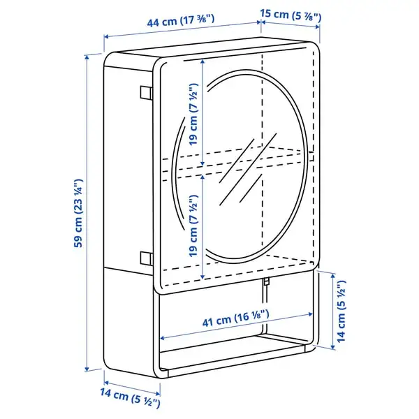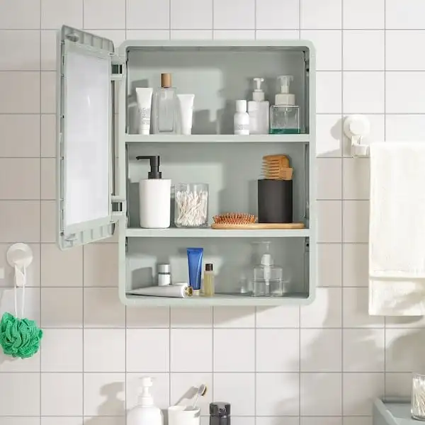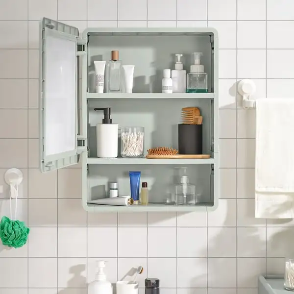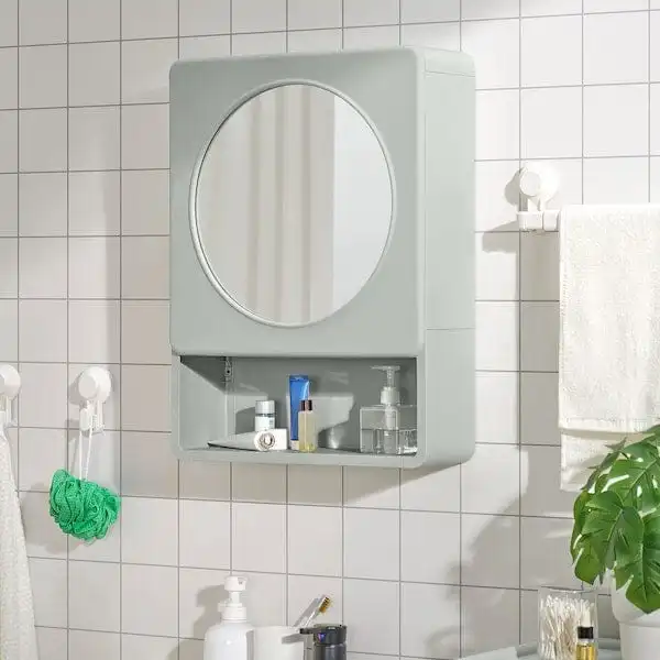 The IVÖSJÖN series offers fresh solutions for small bathrooms. This cabinet with a large round mirror in the centre offers both open and closed storage – a playful mix of functionality and elegance.