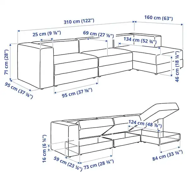 Enjoy long movie nights and comfy socialising with friends in JÄTTEBO modular sofa. Use this combination with a relaxing chaise longue as it is – or create a customised sofa for you and your home.