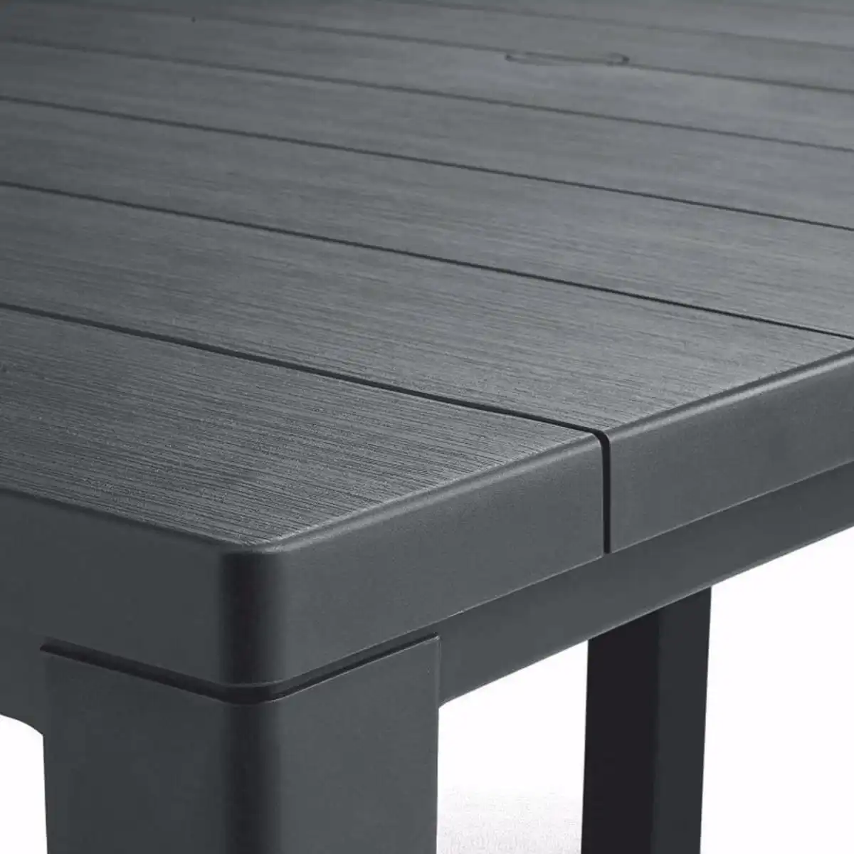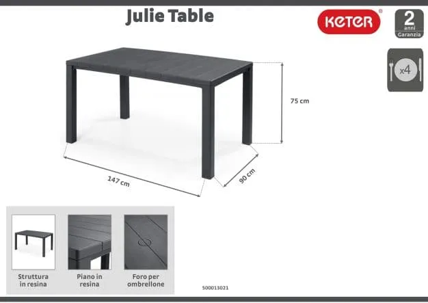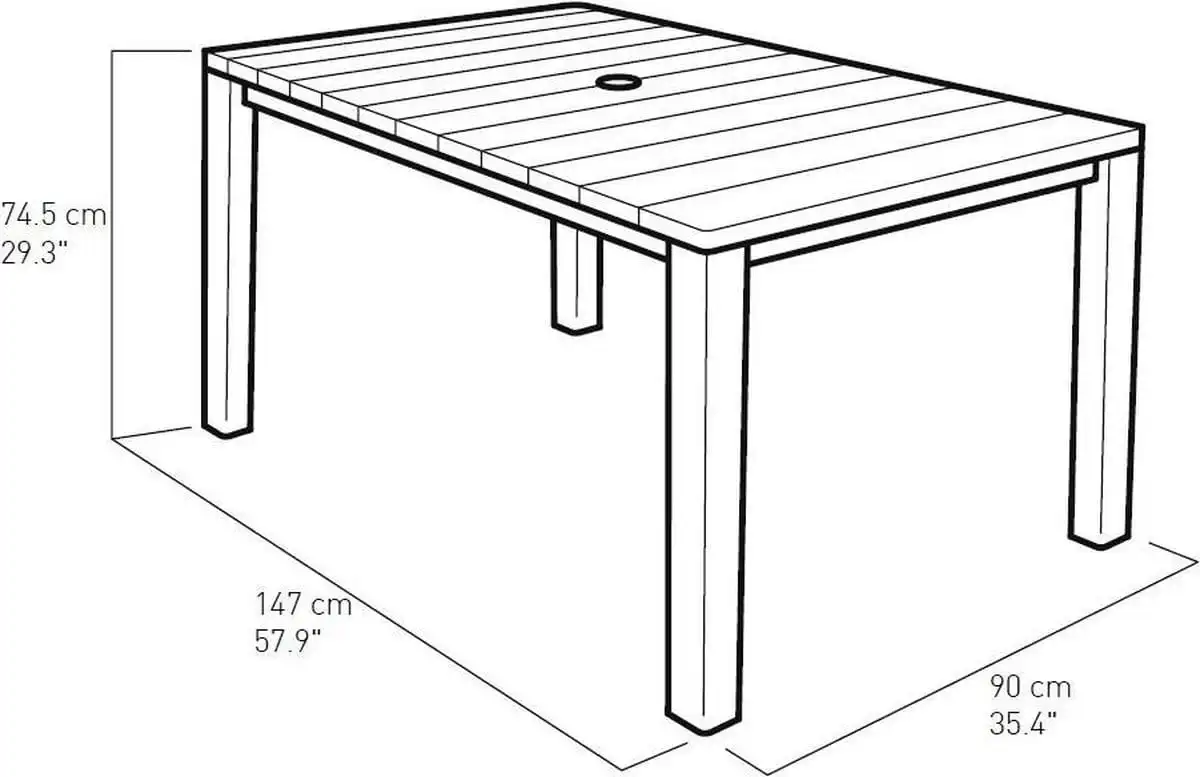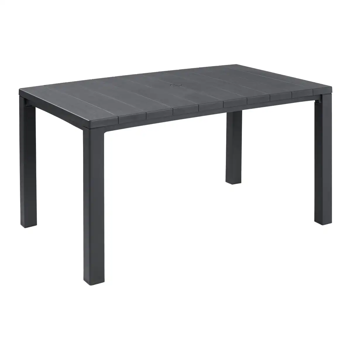 Julie KETER resin garden table with gray/silver resin top for 6 people 147x90cmCan seat up to 6 people, suitable for medium-sized spaces such as verandas, gardens and large terracesResistant to rust. Easy to assemble and clean, requires no special maintenance - 18mm central hole allows easy pairing with a parasol, to provide a shaded area without placing the table under a cover to make the most of the after-meal moment - Maintenance-free. The removable system will also save space when not in useThe central hole allows easy pairing with a parasol, ideal for providing a shaded area Needs no maintenance