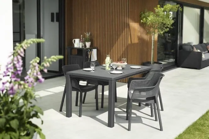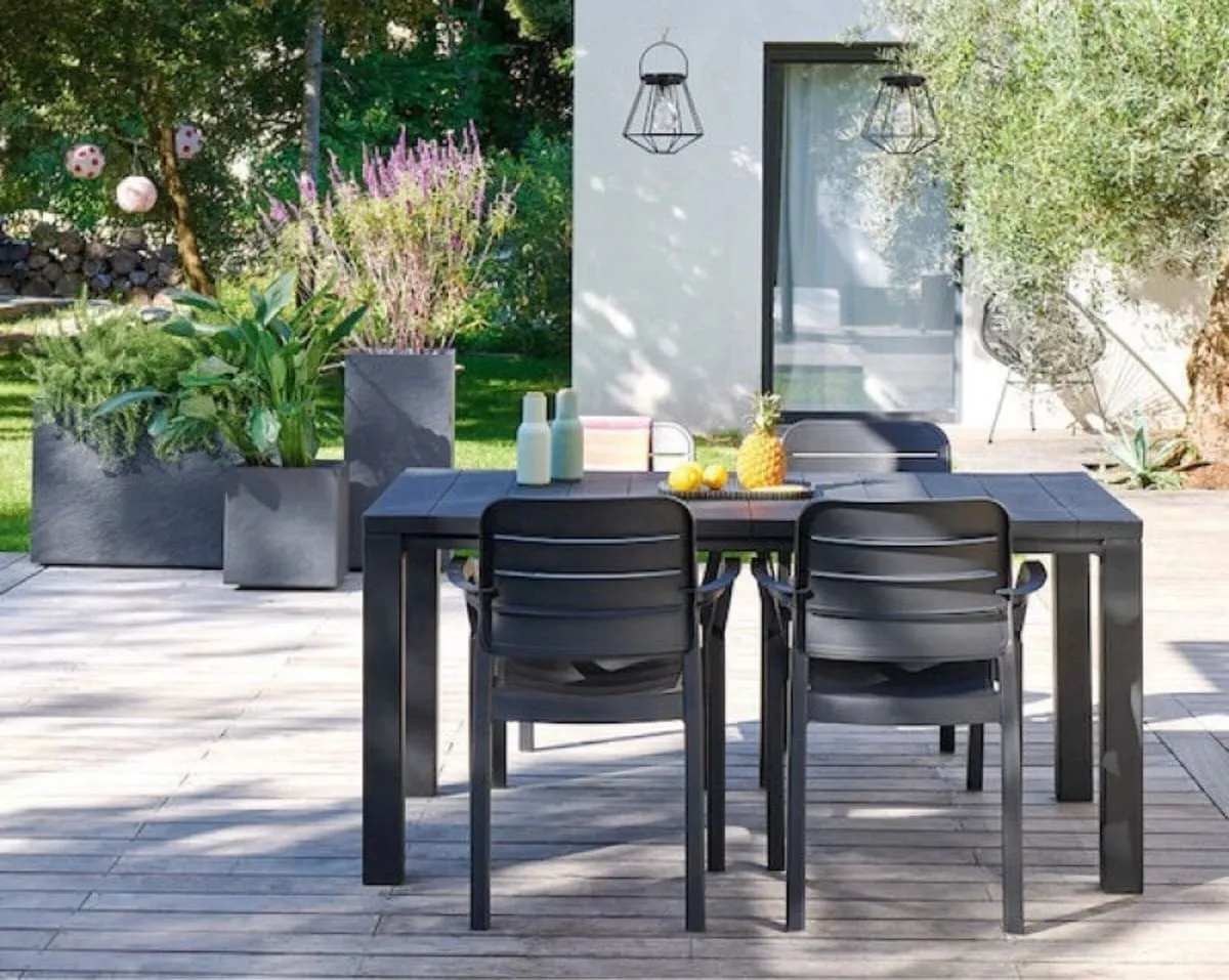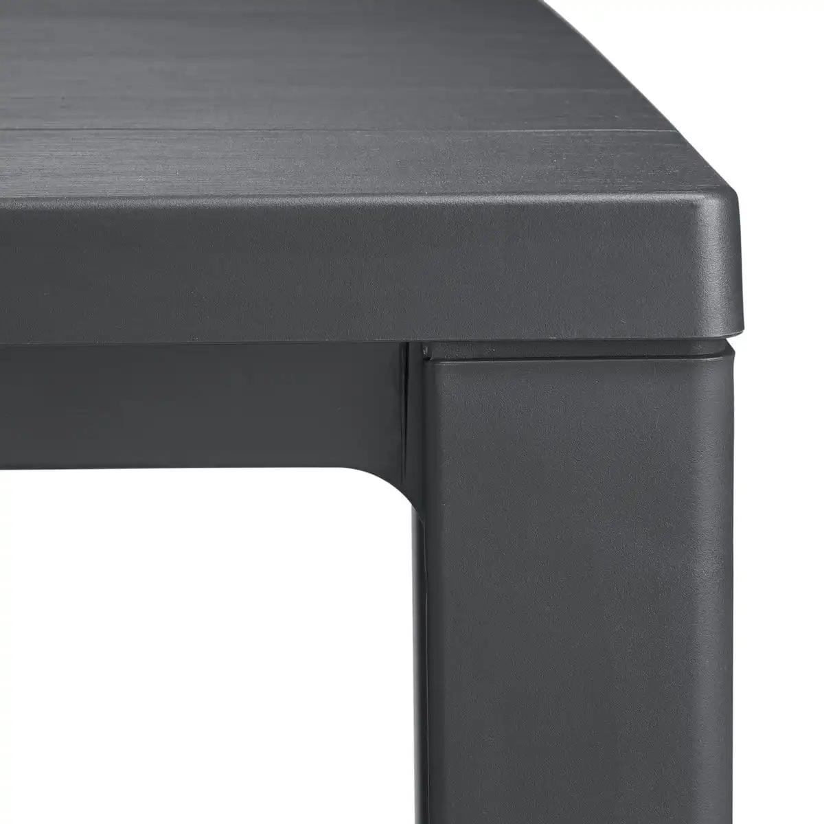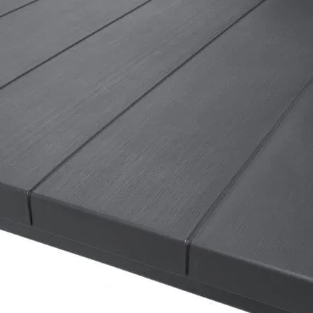 Julie KETER resin garden table with gray/silver resin top for 6 people 147x90cmCan seat up to 6 people, suitable for medium-sized spaces such as verandas, gardens and large terracesResistant to rust. Easy to assemble and clean, requires no special maintenance - 18mm central hole allows easy pairing with a parasol, to provide a shaded area without placing the table under a cover to make the most of the after-meal moment - Maintenance-free. The removable system will also save space when not in useThe central hole allows easy pairing with a parasol, ideal for providing a shaded area Needs no maintenance