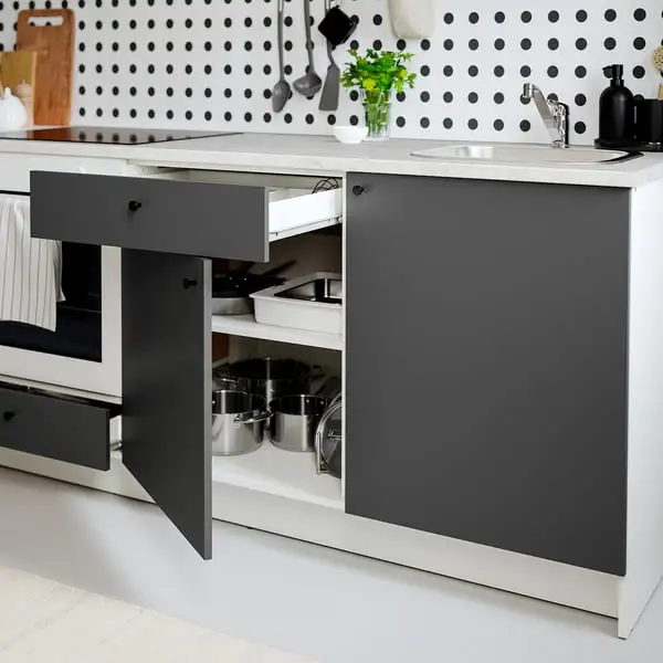 A practical kitchen solution with a balanced mix of base, wall and high cabinets. There is convenient workspace for preparing food, and the high cabinet by the cooking area is ideal for pantry essentials.
