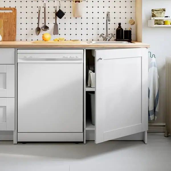 A practical setup with room for many functions to allow a smooth kitchen workflow. There’s generous worktop space for preparing food and storage along the wall for easy access to your secret ingredients.