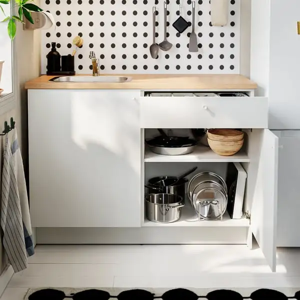 This generous kitchen solution offers a beautiful balance of wall storage that puts everyday items close at hand, and roomy storage inside the base units where you can tuck away larger pots and pans.