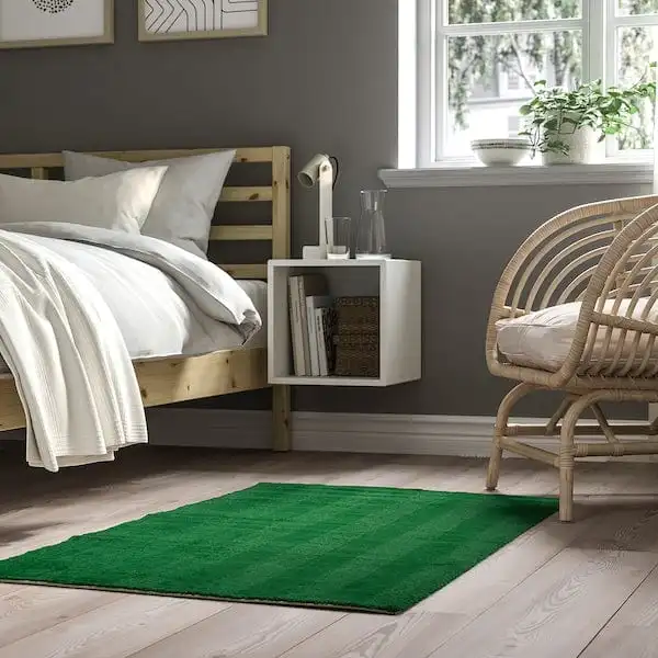 This low pile rug in green feels nice and soft and is easy to vacuum. The mix of straight and curly yarns creates a timeless stripe pattern. Ideal as a bedside rug – your feet will thank you.