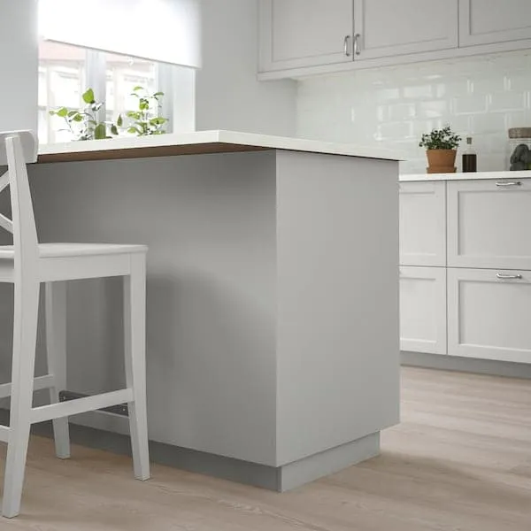 The solid wood frame with bevelled edges and inset veneer panel give LERHYTTAN kitchen fronts a classic, traditional look. The light grey finish creates a cosy kitchen with timeless feel.