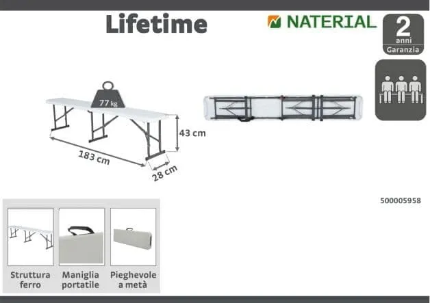 Lifetime iron folding cushionless garden bench white colorIdeal for occasional outdoor use. Foldable to ensure maximum space saving when not in use. Easy to transport.To match the folding table in the same series.