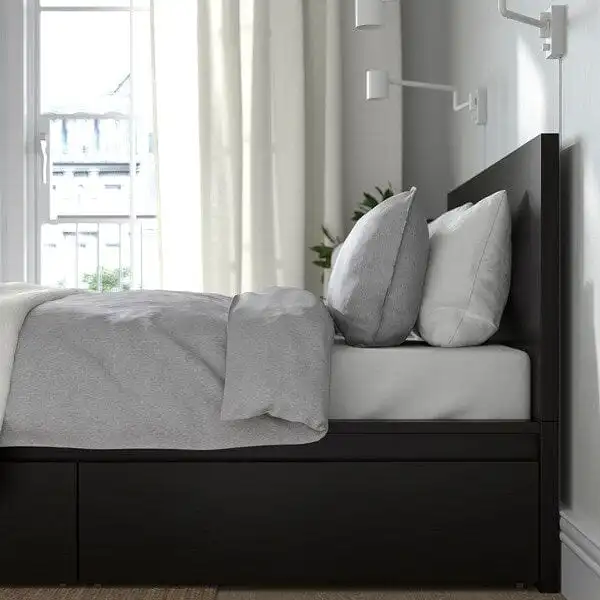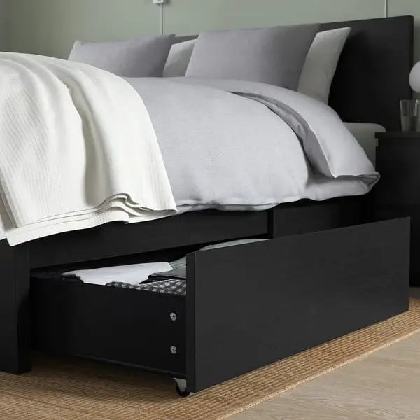 A clean design with solid wood veneer. Place the bed freestanding or with the headboard against a wall. You also get spacious storage boxes that roll out smoothly on castors.