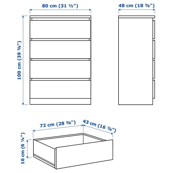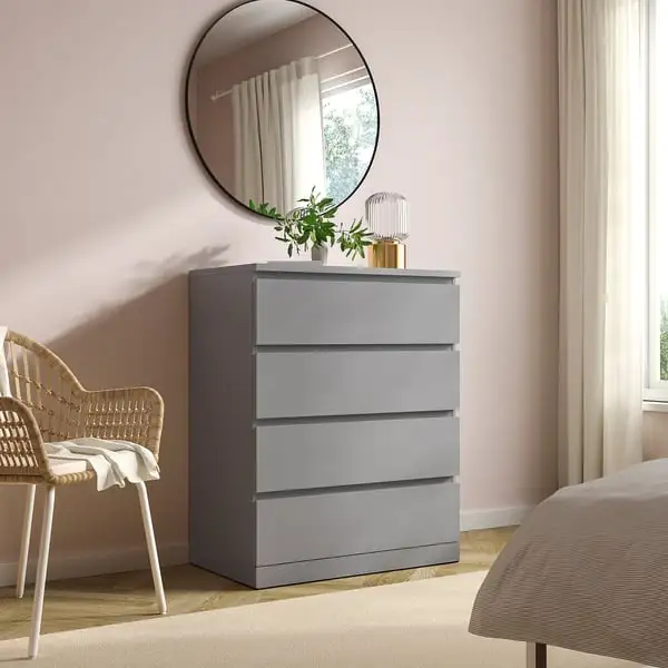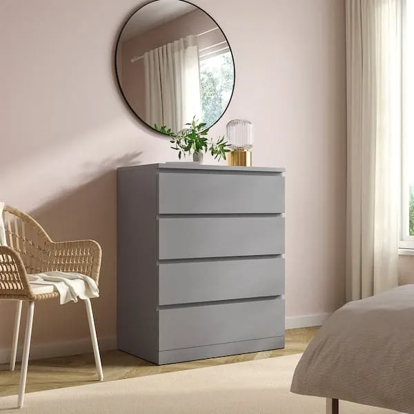 A clean look that fits right in, in the bedroom or wherever you place it. Smooth-running drawers and comes in several colours – here in a warm grey-stained finish. Psst! Remember to anchor it to a wall.