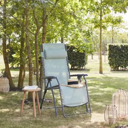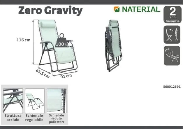 ZERO GRAVITY STEEL-TEXT MULTIPOSITION RELAX ARMCHAIR WITH AGAVE GREEN CUSHIONIdeal for relaxing in the garden or on the terraceMultiposition for legs and backEasy to transport and foldEasy to transport and foldElectro-polyester and steel construction and resistant to outdoor