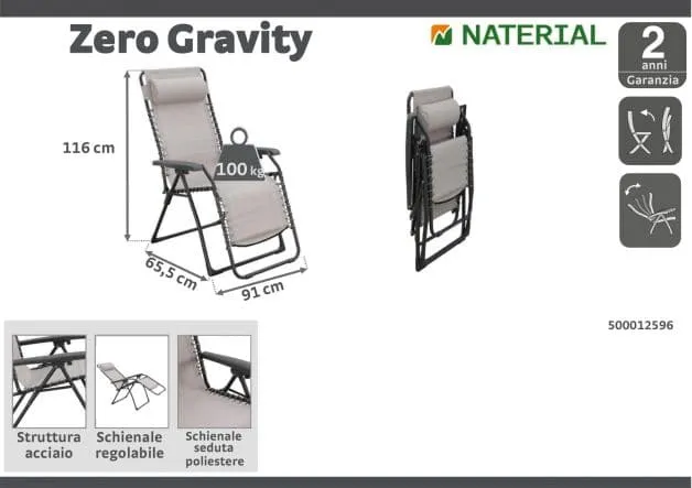 ZERO GRAVITY STEEL MULTIPOSITION RELAX ARMCHAIR, WITH CUSHION, TORTORIdeal for relaxing in the garden or on the patioMultiposition for legs and backEasy to transport and foldEasy to transportEasy to foldThe headrest cushion is included to ensure maximum comfort