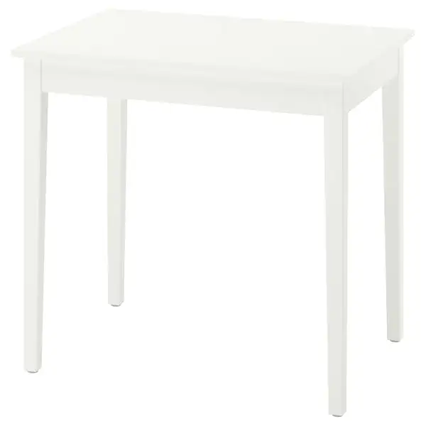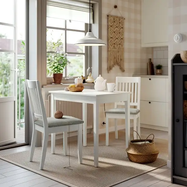 NÄSINGE dining series combines updated farmhouse charm with modern functionality. This 2-seat table with smooth melamine top and hardwood chamfered legs adds coziness to smaller kitchens or living rooms.