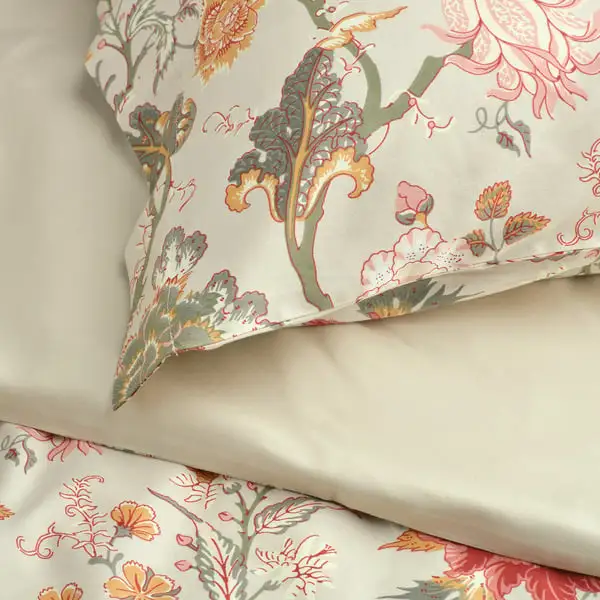 Sateen-woven with a fine lustre for everyday elegance. Floral pattern on one side and a solid light grey-beige colour on the other. The smooth cotton/viscose blend feels soft to the touch and breathes.