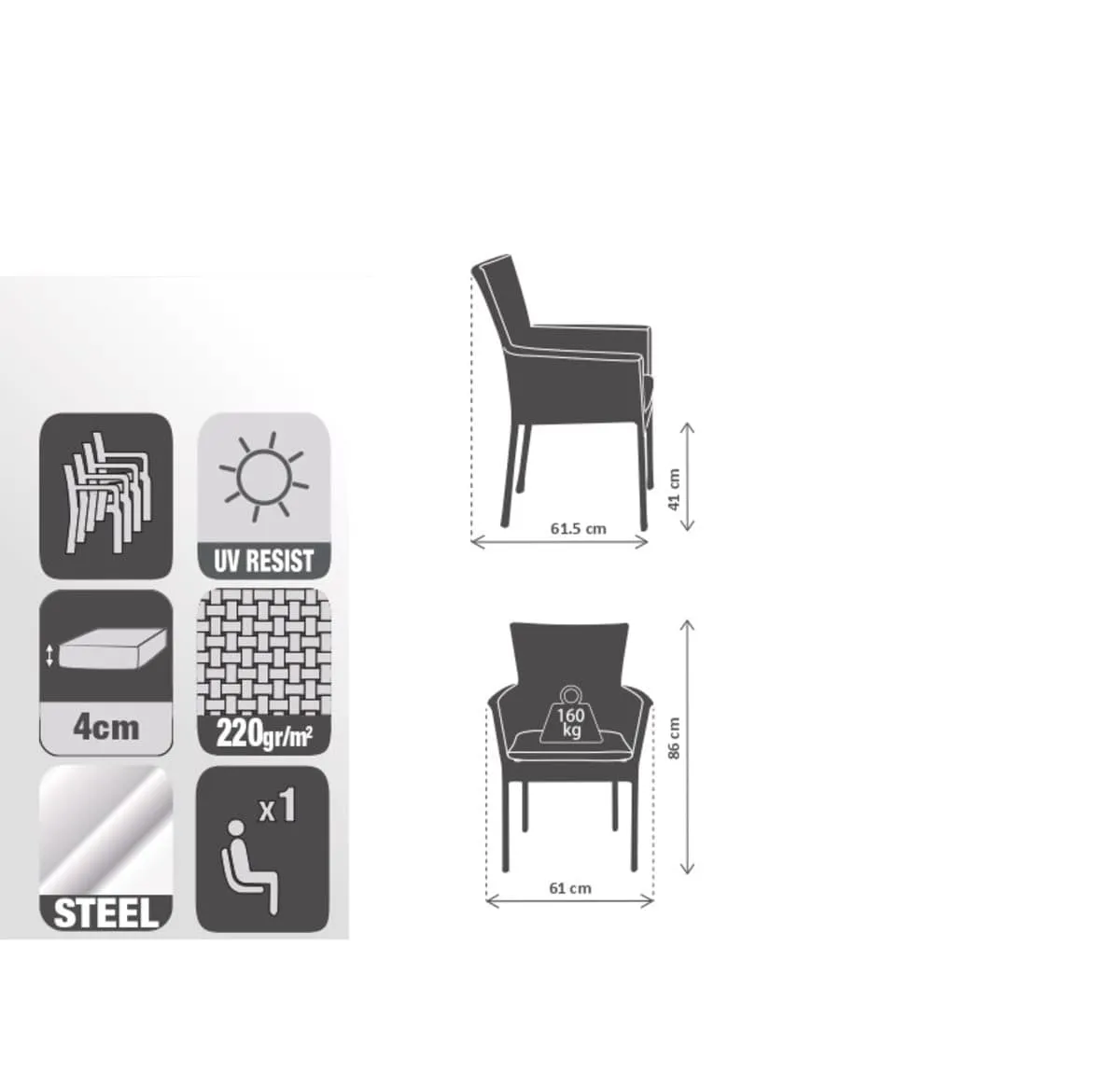 Garden chair with steel cushion Noa NATERIAL anthracite colorIdeal for completing garden or terrace furniture in combination with the Noa series. The seat is made of easy-care flat woven resin. This resin is made of PE and is resistant to large temperature variations (50° to -20°) and over time. The cushion is included.The polyethylene braid is made of 60% recycled material from the recovery of plastic bottles