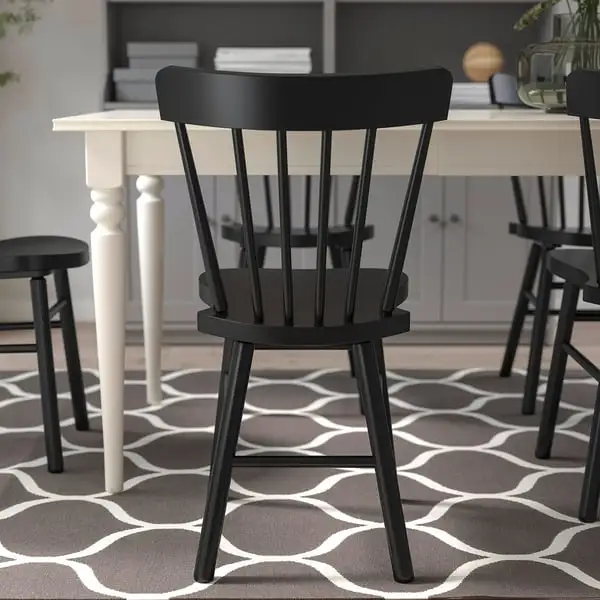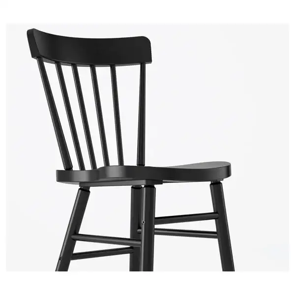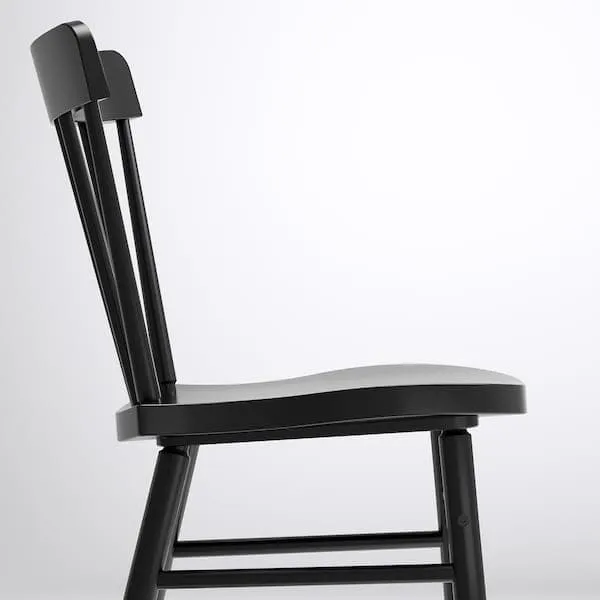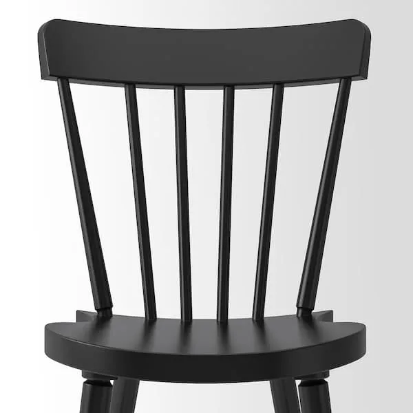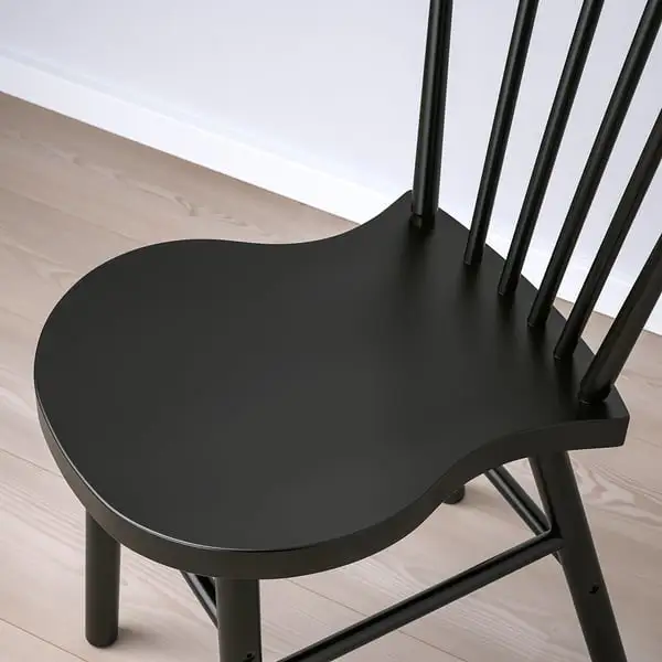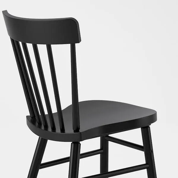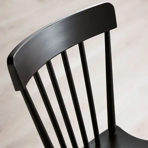 A sturdy spindle chair in deep black, designed with rounded shapes and angles for comfort and beauty - a perfect spot to relax and feel good during everyday activities around the table.
