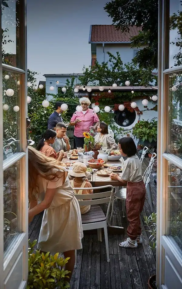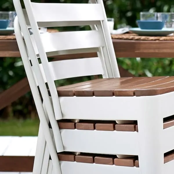 Lightweight, yet sturdy dining chair in a farmhouse style. Here you sit comfy while enjoying food and socialising outdoors. Made of steel with a seat in durable wood – goes perfectly with NORRMANSÖ table.