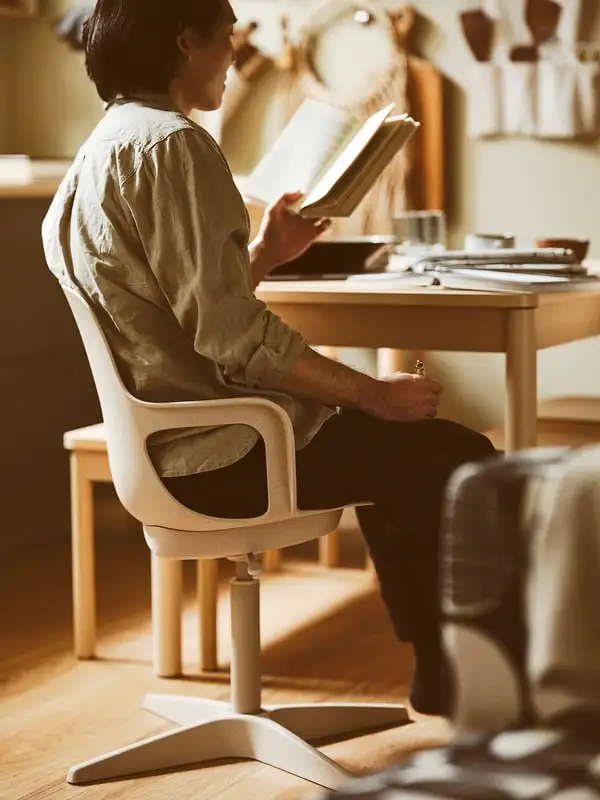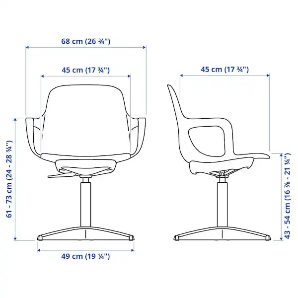 Simple design with good comfort. The bowl-shaped seat and rounded shape of the backrest make ODGER swivel chair comfy. Adjustable height and swivel allows you to find a sitting position that suits you.