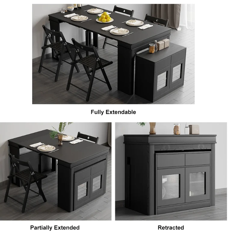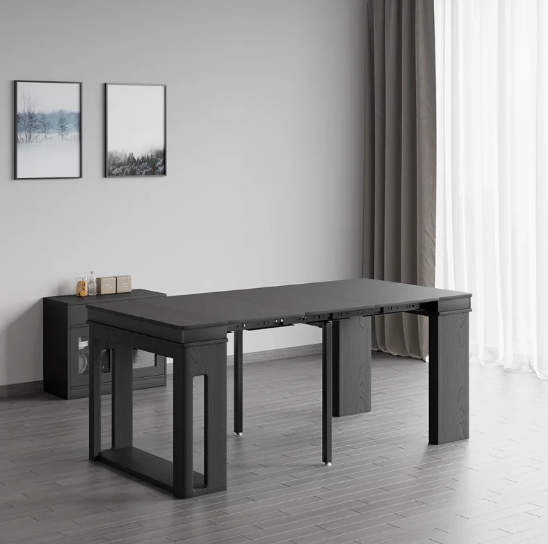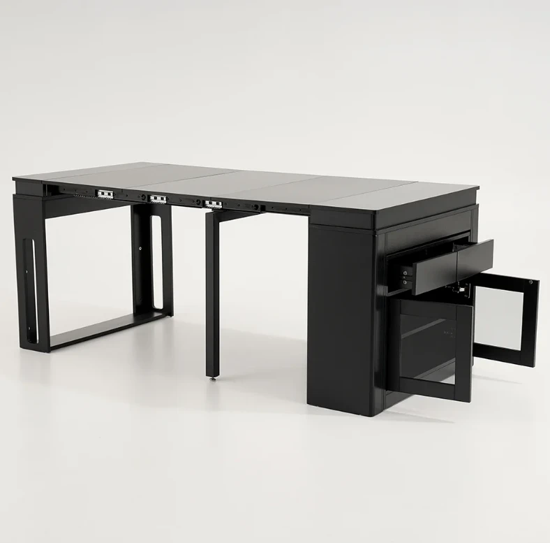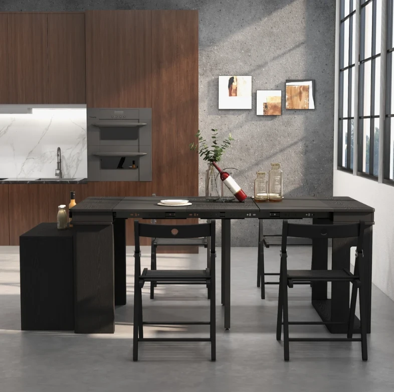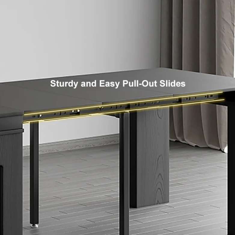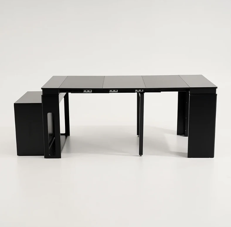 The Outdoor table is an ideal patio dining choice. Extending to seat 10 people, this table offers convenience and multi-functionality for large dinner parties. It is equipped with self-storing extensions and a storage bar that rotates 360 degrees to act as support and remain sturdy under lots of weight. Perfect for a flat outdoor patio or wood deck, this table has a durable water and weatherproof high-pressure laminate finish and powder coated steel legs. Seats 10.