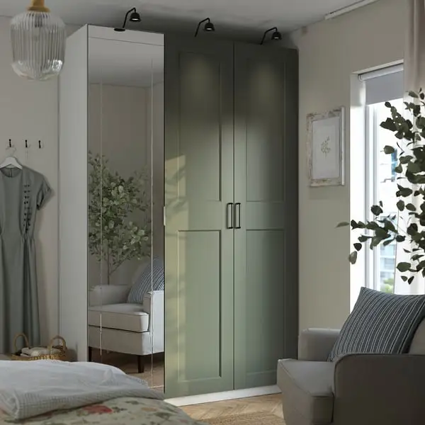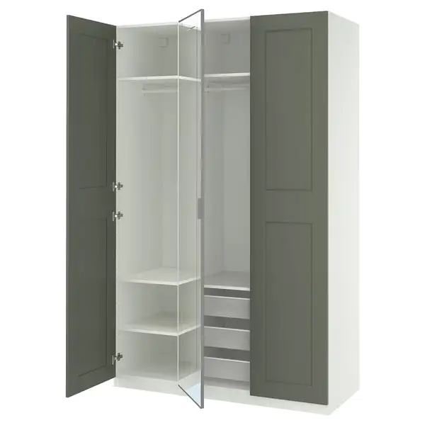 PAX / KAMMARTORP/GRIMO wardrobe combination, white mirror glass/grey grey-green, 150x60x236 cm