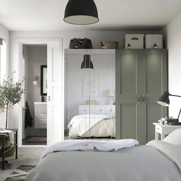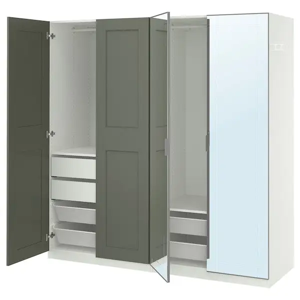 PAX / KAMMARTORP/GRIMO wardrobe combination, white mirror glass/grey grey-green, 200x60x201 cm
