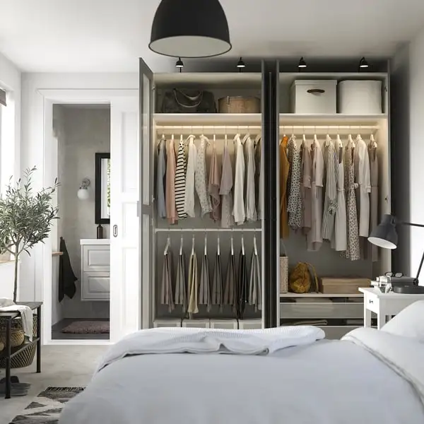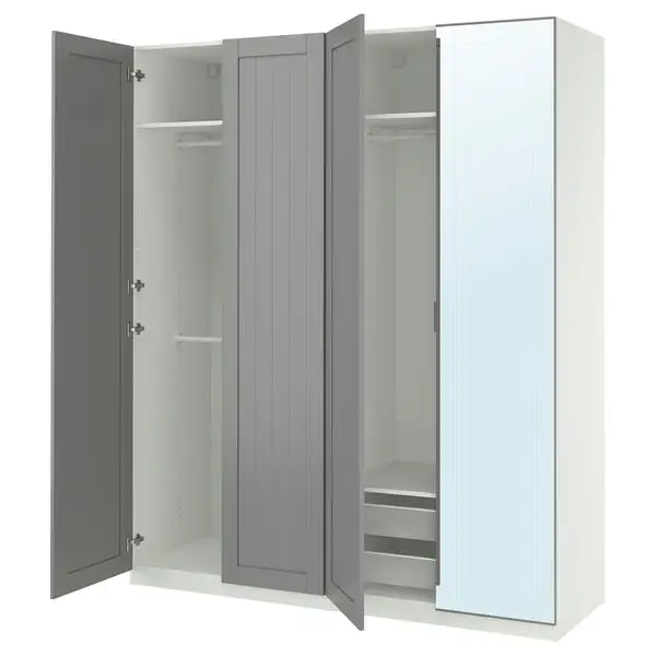 Why hide away your clothes? Display them instead! This wardrobe with GRIMO sliding doors has glass at the top and gives your freshly ironed shirts or colourful dresses the attention they deserve.