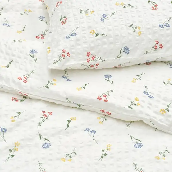 Elegant PILDVÄRGMAL duvet cover set with pretty little blooms and seersucker texture that keeps you cool and comfy. The fabric is made of a soft cotton/viscose blend that breathes and has a fine sheen.