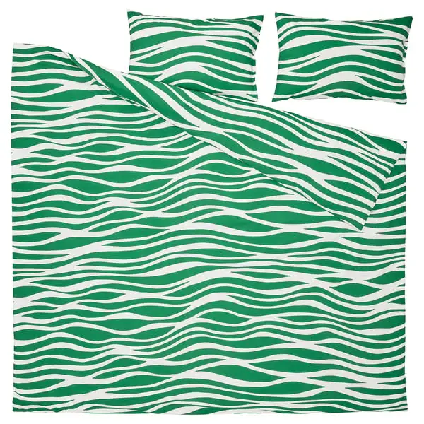 PORTLAKMÅLLA duvet cover set is decked with wavy green stripes in a pop of green that brings a fresh new look to your room. The cotton/viscose blend offers a fine sheen, breathes and feels soft.