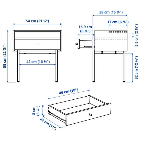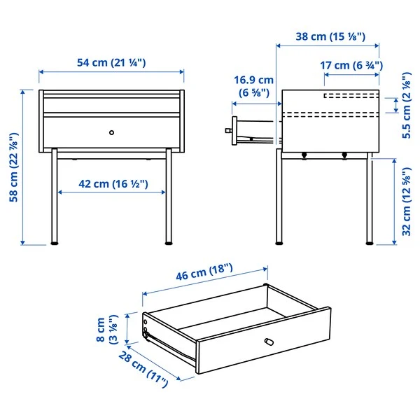 The RÅDMANSÖ series is inspired by mid-century design with sleek lines, great functionality and a warm walnut tone. This bedside table has a drawer and a shelf – and cable management to hide your cords.