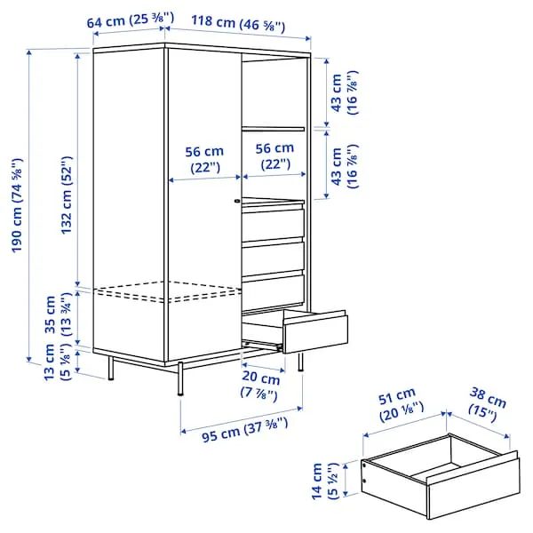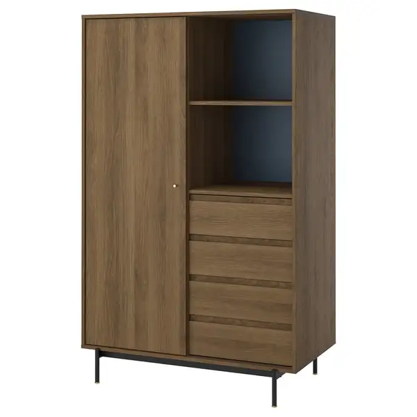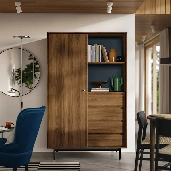 The RÅDMANSÖ series is inspired by mid-century design with sleek lines, great functionality and a warm walnut tone. This wardrobe has space for both hanging and folded clothes – and a smart sliding door too.