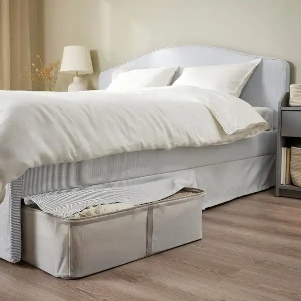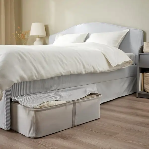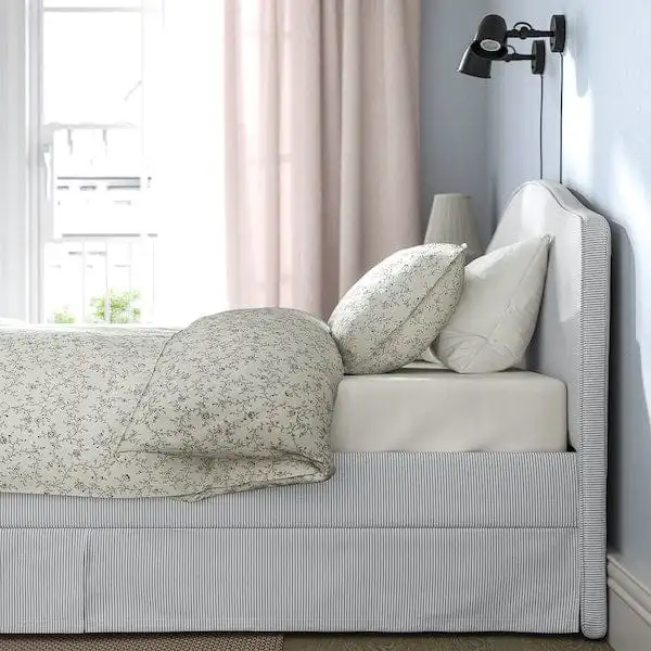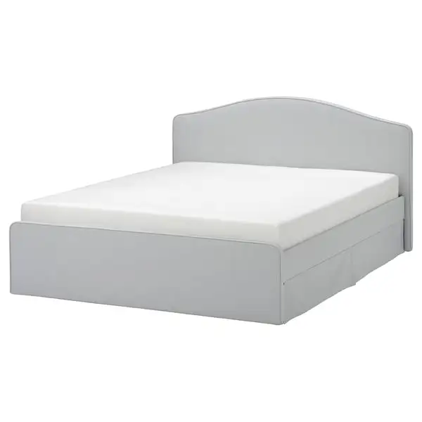 This upholstered bed frame makes your bedroom feel soft and warm. The curved headboard and piped edges create a classic look – and the entire cover is removable and machine washable.