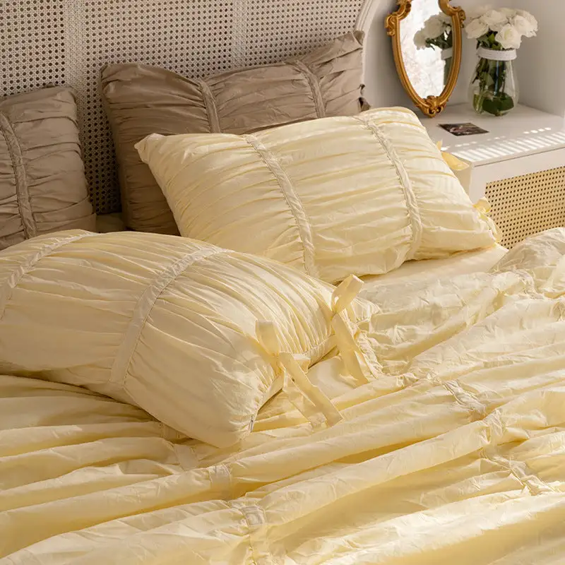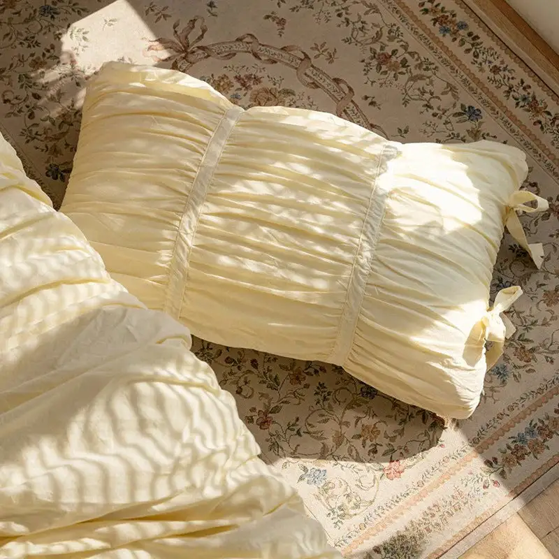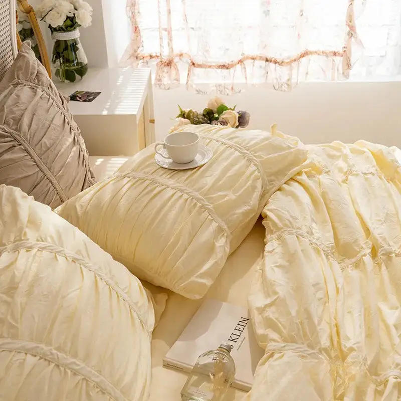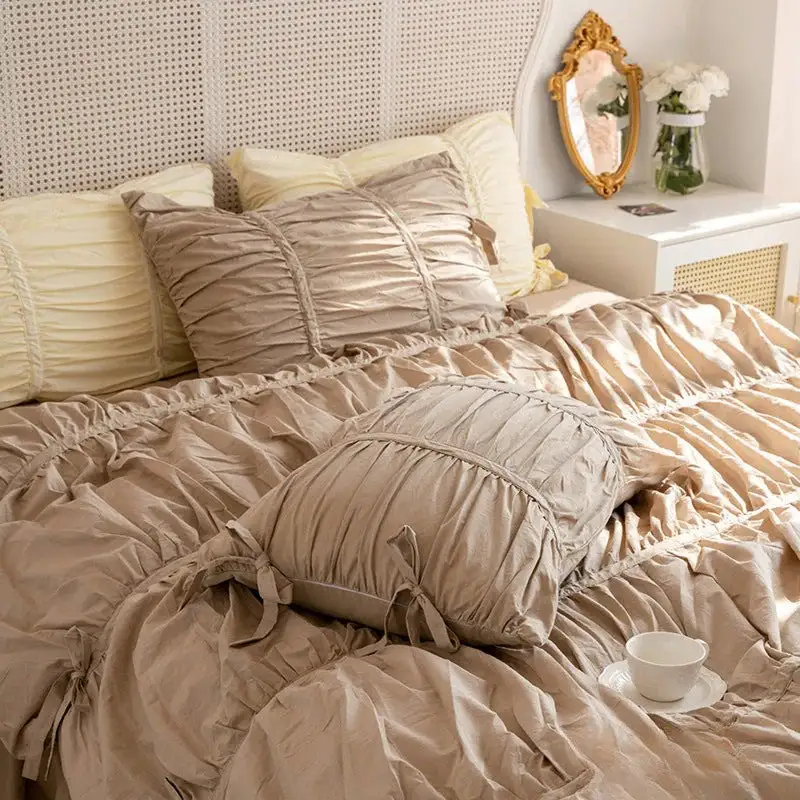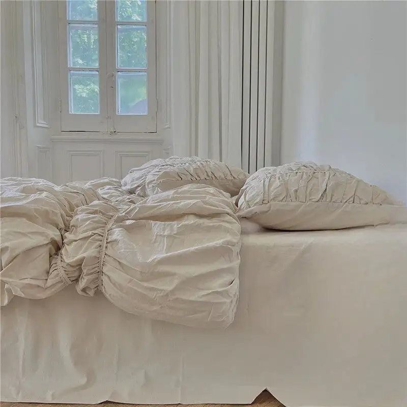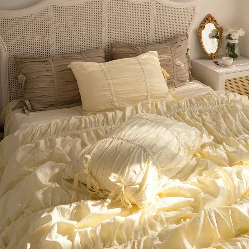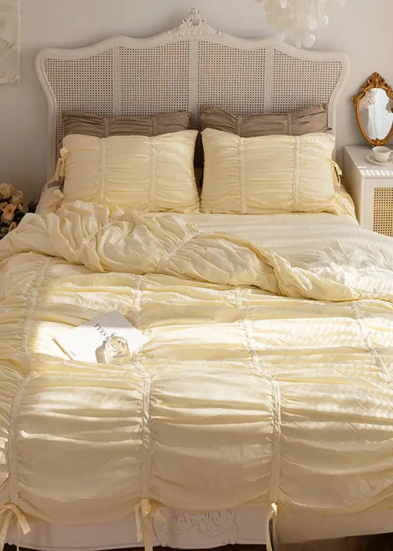 Experience the charm of cottagecore and regal elegance with Royal Beige Bedding Set. Crafted from premium 100% washed cotton, this bedding set features exquisite stitching for a luxurious layered effect. Available in two sophisticated neutral shades, it adds a touch of timeless beauty and cozy comfort to your bedroom. The duvet cover is designed with corner ties and a hidden zipper, ensuring your duvet insert stays perfectly in place. Enhance your sleep space with this blend of coquette charm and refined elegance.