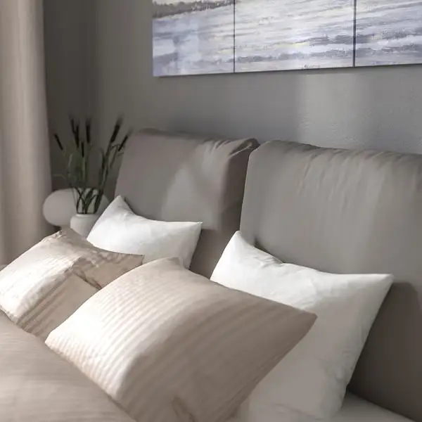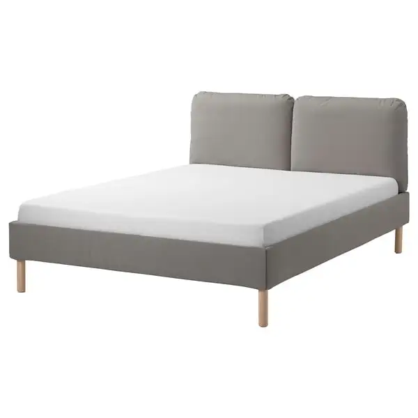 This upholstered bed frame has a slightly sloped headboard with 2 soft inviting pillows – perfect as a backrest when you sit in bed. Also, the cover of the entire frame is removable and machine washable.