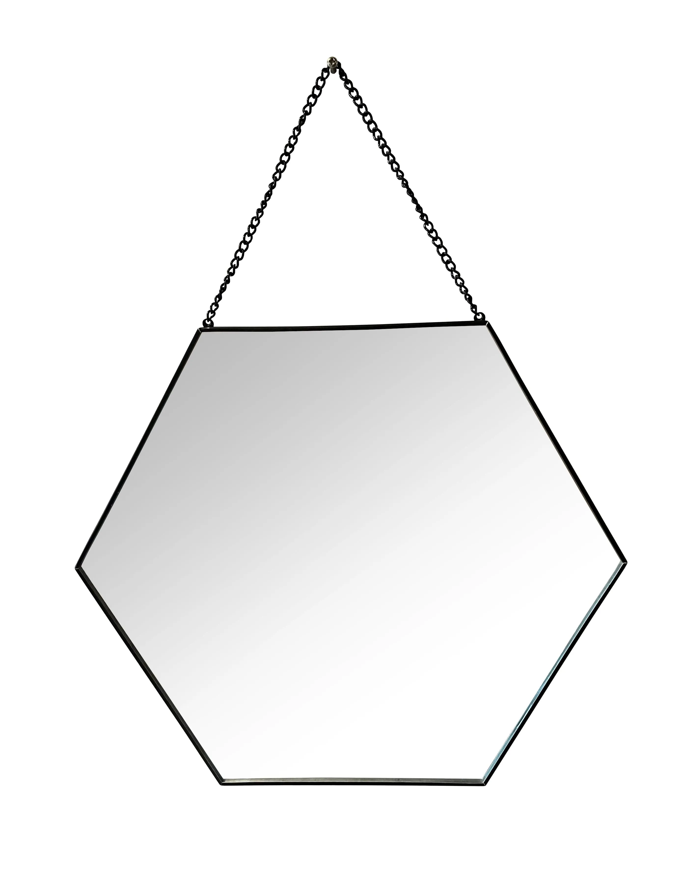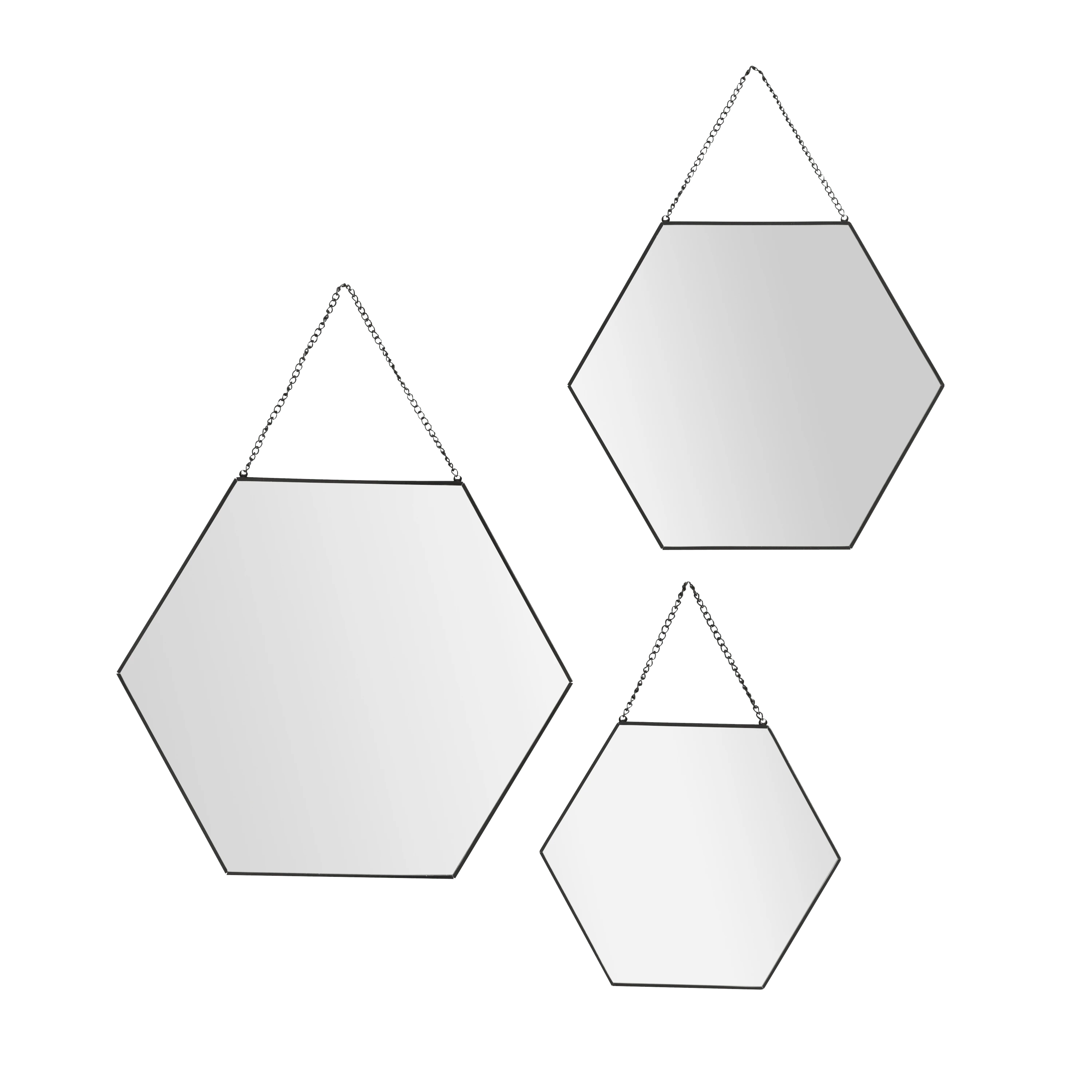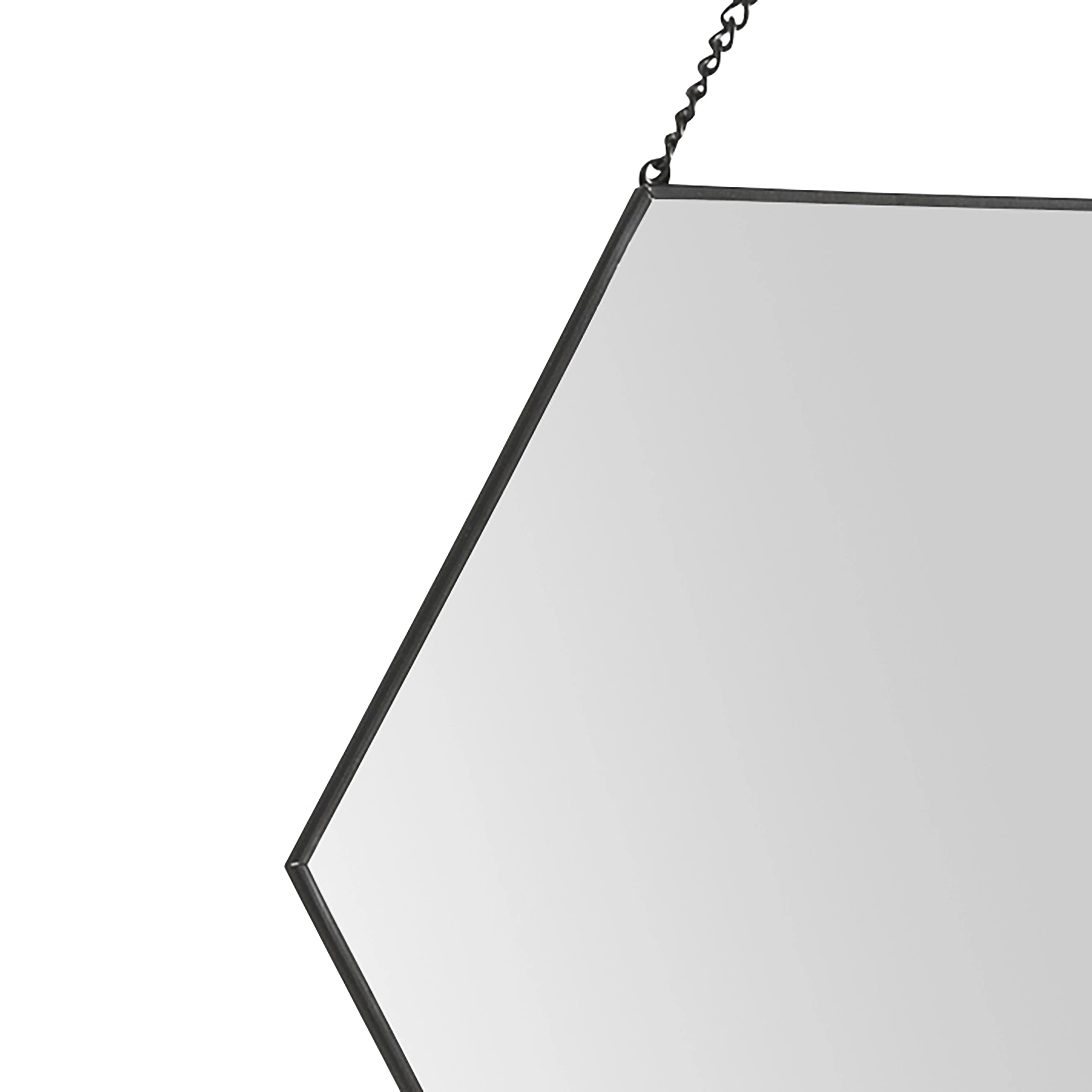 Set of 3 black metal hexagonal mirrors Ideal for decorating your walls in an original way Hang them easily thanks to the black metal chain fasteners (screws and dowels sold separately)