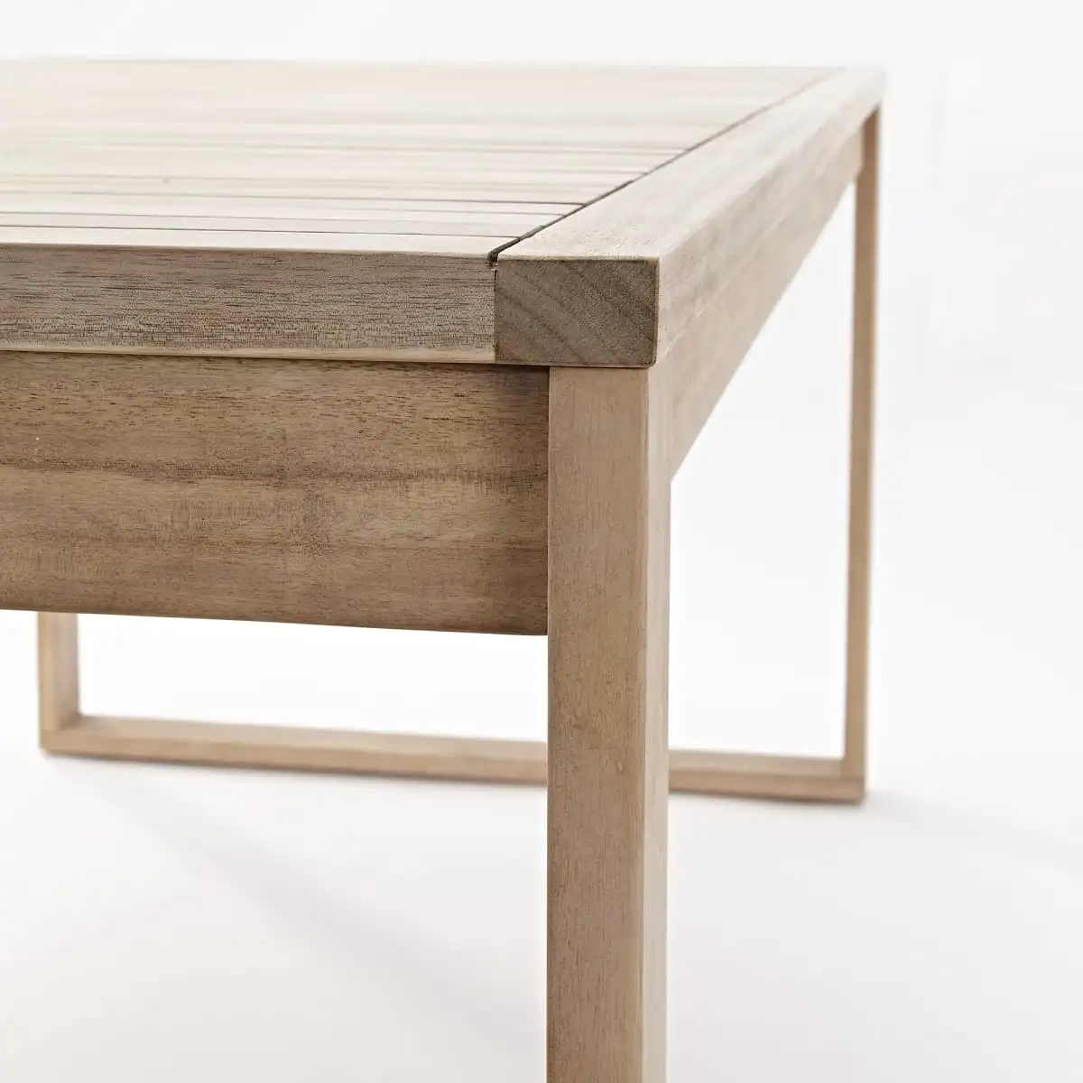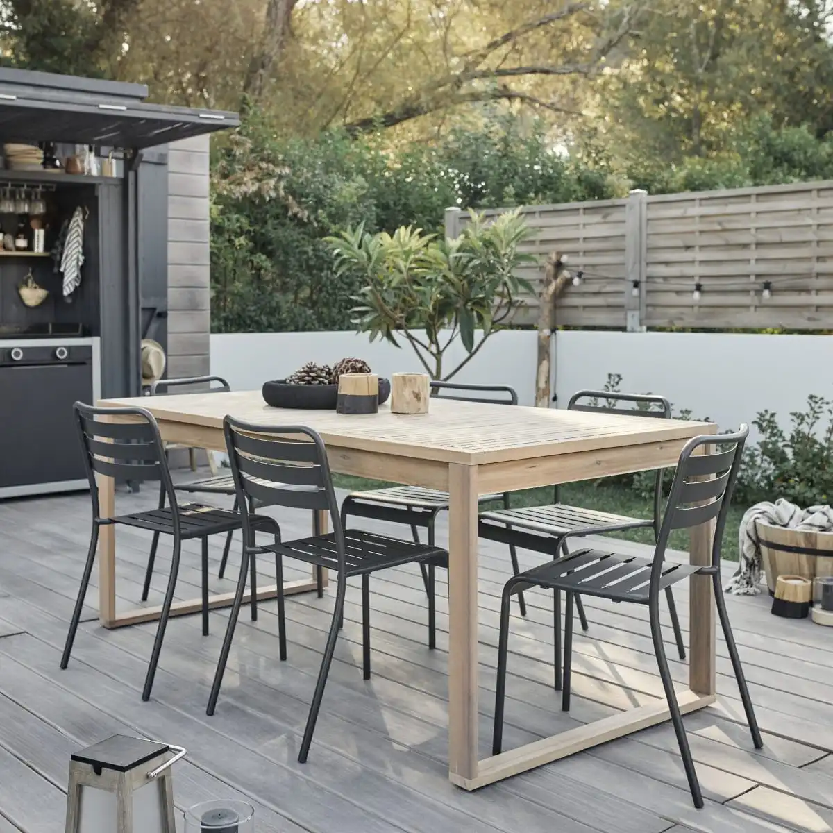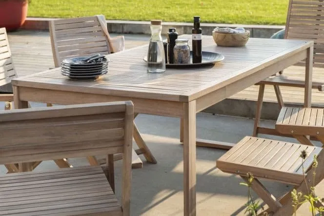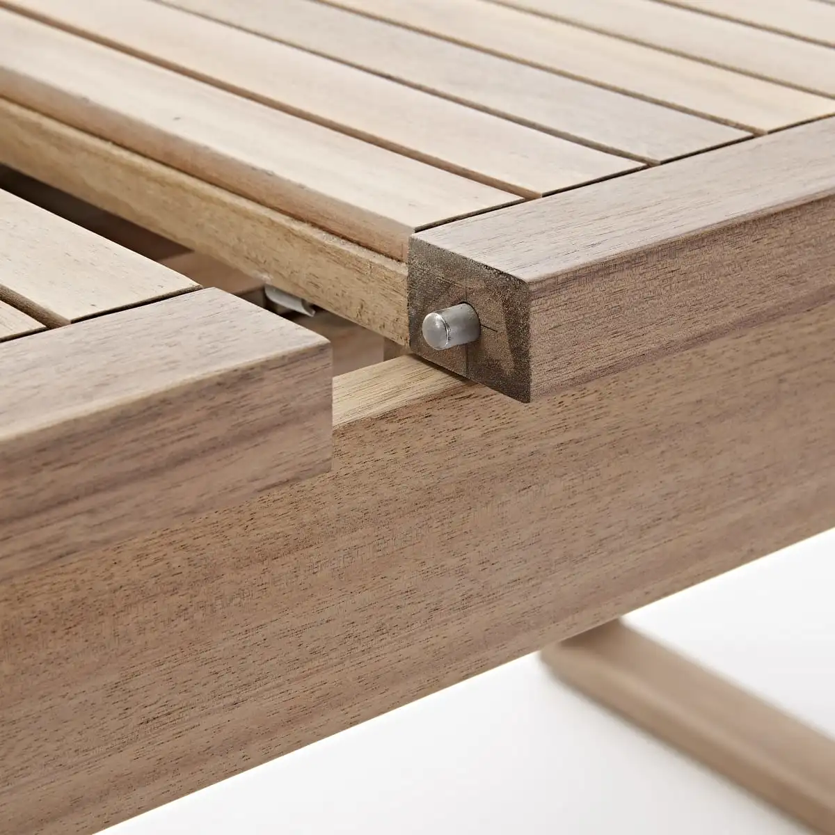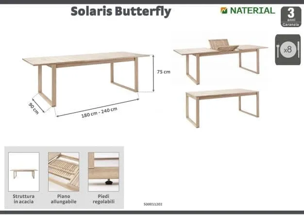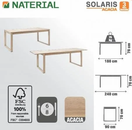Solaris NATERIAL rectangular extendable garden table with wooden topW 180 x D 90 cmFor 6 to 8 people, suitable for large and spacious rooms such as gardens and verandas or particularly large terracesThe finishing oil leaves the wood with its natural blond appearance. The FSC label allows you to make a conscious choice for products that are obtained from ecologically appropriate forest managementAdjustable legs for installation even in gently sloping terrainExtension of the table, stored inside the tray, allows you to comfortably seat 2 more people